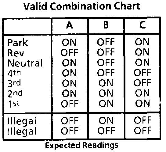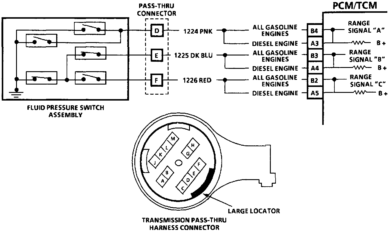 The fluid pressure switch assembly consists of five pressure switches combined into one unit and mounted on the valve body. The PCM/TCM supplies switched battery voltage to the fluid pressure switch assembly on three separate wires. By grounding one or more of these circuits through various combinations of the pressure switches, the PCM/TCM detects what gear range has been selected by the vehicle operator