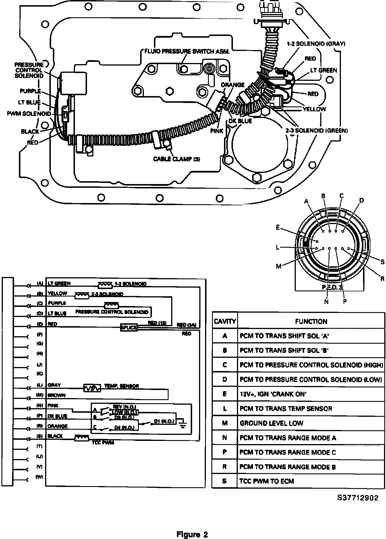The electrical wiring harness is updated with an extra length on one of the conduits leading to the pressure control solenoid on the control valve assembly.