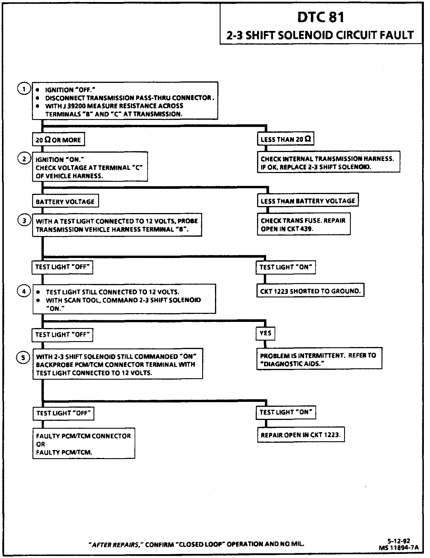 The PCM/TCM continually monitors voltage on each circuit connected to the quad driver looking for either low or high voltage depending on the commanded state of the devices connected. Code 81 will set if a fault has been detected on the 2-3 shift solenoid circuit. If 2-3 shift solenoid is commanded "ON" by the PCM/TCM, the voltage should drop when the solenoid is grounded, if the voltage stays up for at least 2 second, Code 81 will be set. The opposite is also true if 2-3 shift solenoid is "OFF" then the voltage on the circuit should remain high, if voltage drops for more than 2 second, then Code 81 will be set.