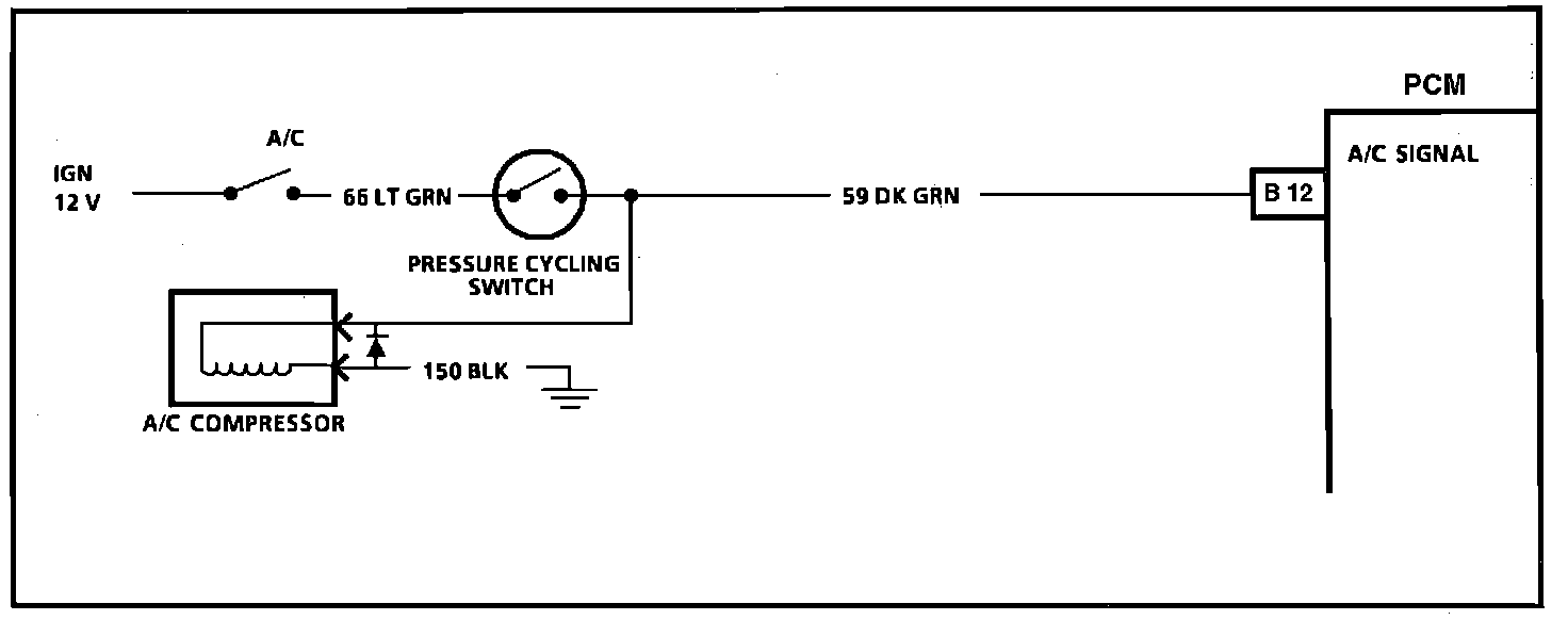 Turning "ON" the air conditioning supplies CKT 59 battery voltage to the A/C compressor clutch and to terminal "B12" of the PCM connector to increase and maintain idle speed.