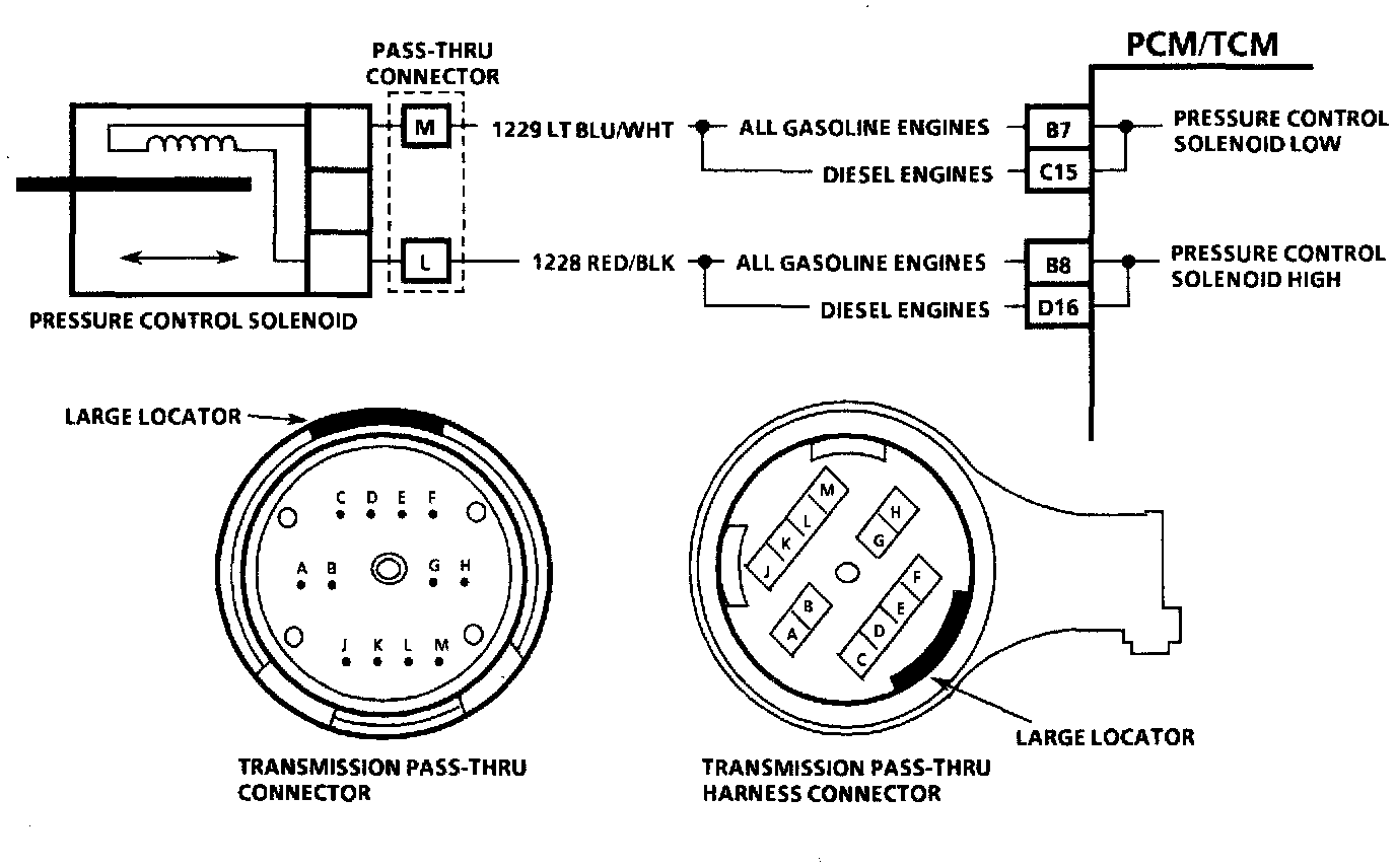 The pressure control solenoid is a PCM/TCM controlled device used to regulate transmission line pressure. The PCMfI1CM compares the TP voltage, engine RPM, and other inputs to determine the line pressure for a given load. The PCM/TCM then regulates the pressure by applying a variable amperage to the pressure control solenoid. The applied amperage varies from 0.1 to 1.1 amps.