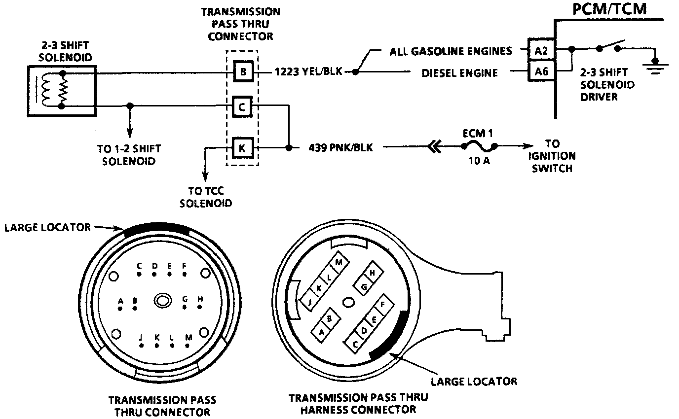 Fused ignition is supplied to the 2-3 shift solenoid. The PCM/TCM will engage the 2-3 shift solenoid by grounding CKT 1223 to energize the 2-3 shift solenoid. The 2-3 shift solenoid is usually green in color.