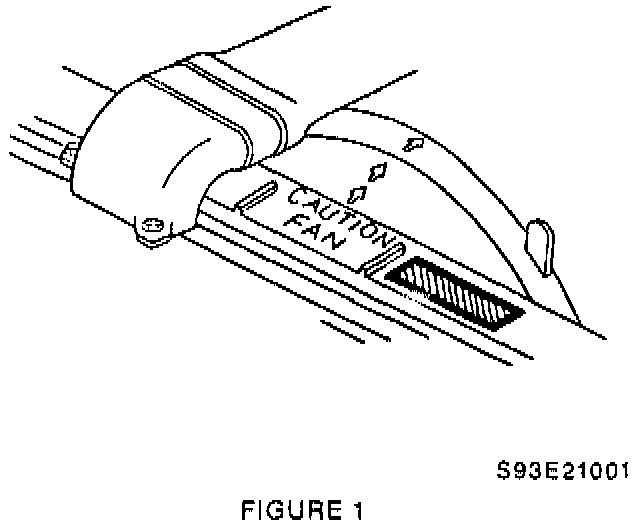 6. Install label to the shaded area of the engine fan shroud as shown in Figure 1. Make sure that the print is readable from the front of vehicle. The label is required by law and must be in position as shown.