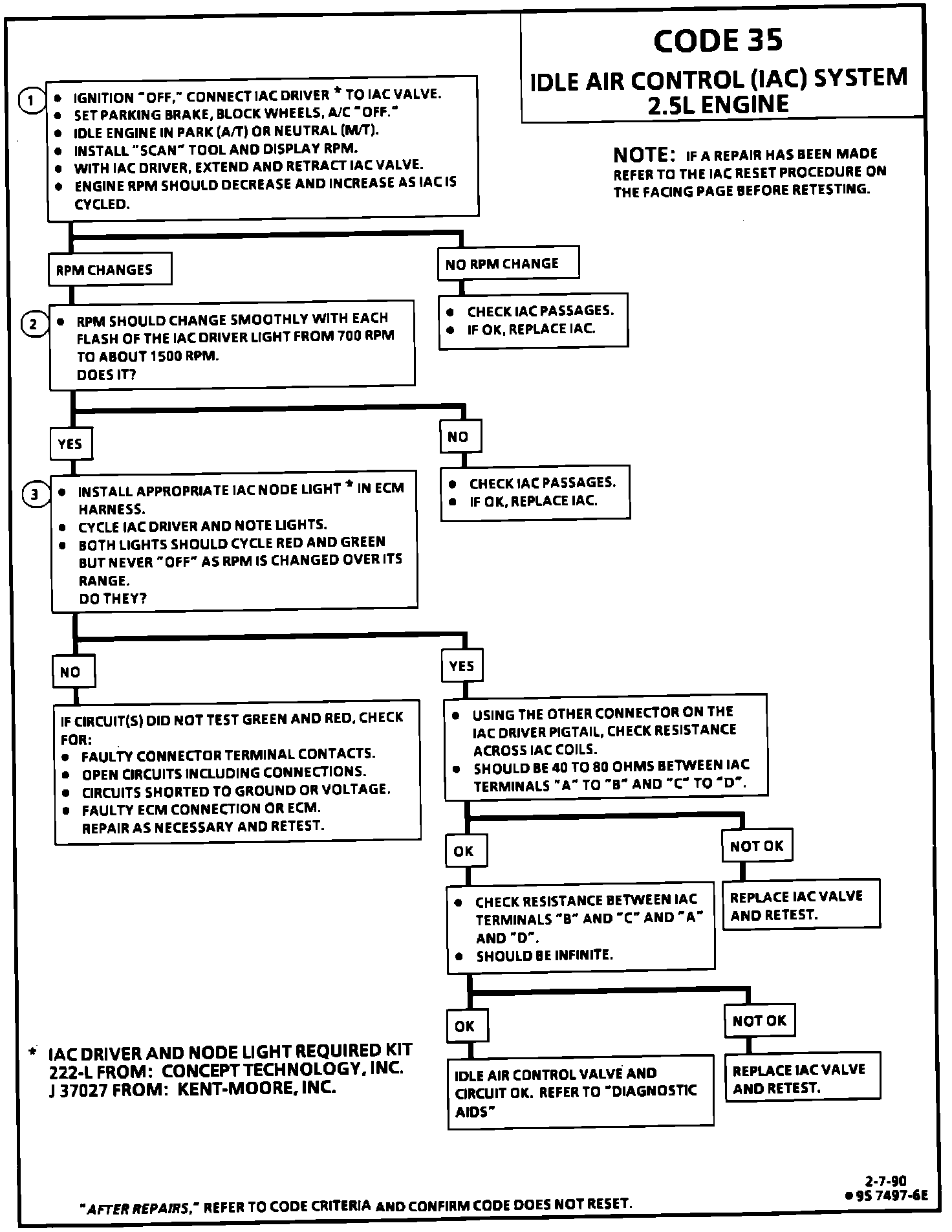 A slow, unstable, or fast idle may be caused by a non-IAC system problem that cannot be overcome by the IAC valve. Out of control range IAC Tech 1 "Scan" tool counts will be above 60 if idle is too low, and zero counts if idle is too high. The following checks should be made to repair a non-IAC system problem.