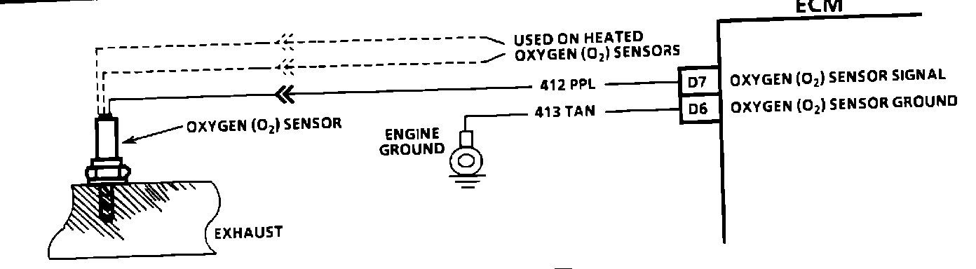 The ECM supplies a voltage of about .45 volt between terminals "D6" and "D7". (If measured with a 10 megohm digital voltmeter, this may read as low as .32 volt.) The Oxygen (02) sensor varies the voltage within a range of about 1 volt if the exhaust is rich, down through about .10 volt if exhaust is lean.