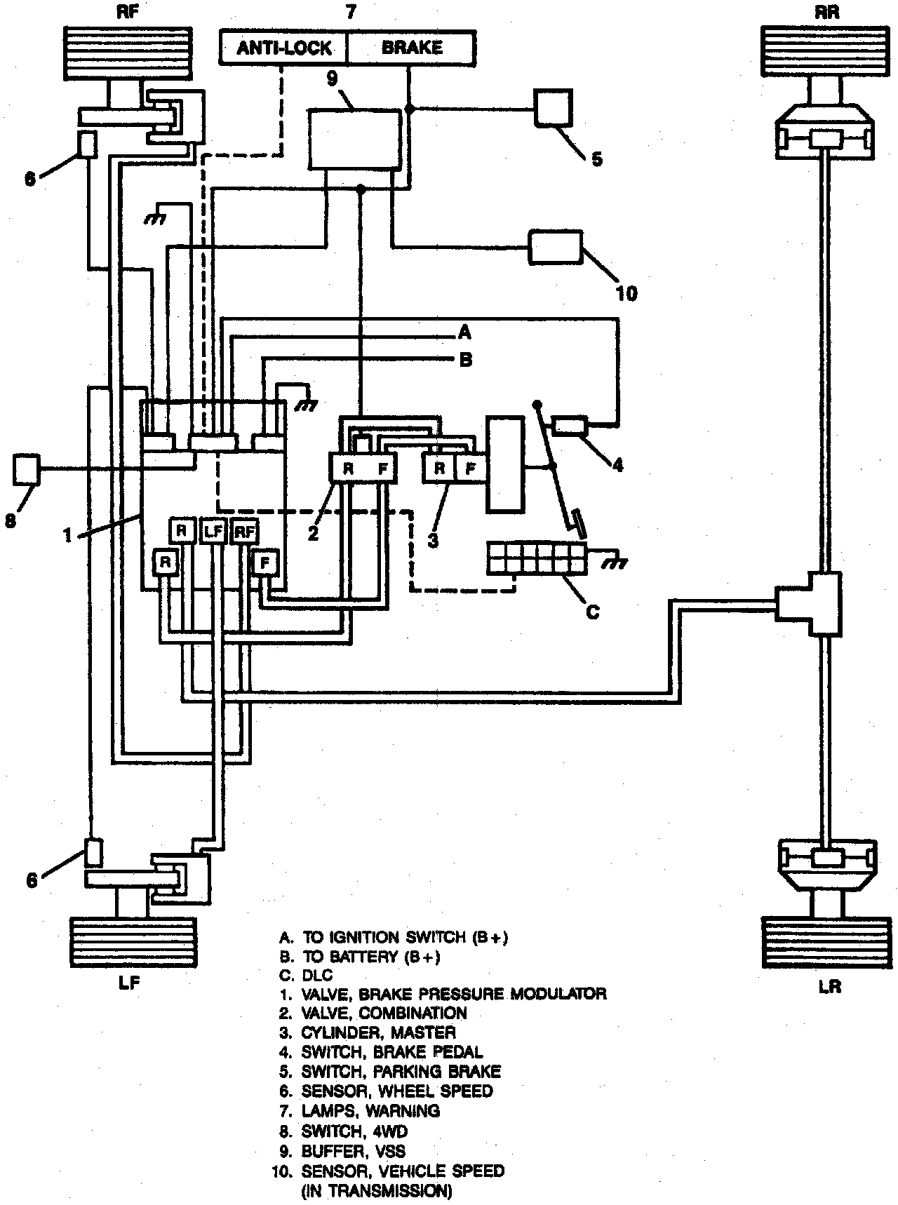 The brake pressure modulator valve (BPMV) receives input signals from the vehicle speed sensor (VSS) buffer for the rear wheels, wheel speed sensors (WSS) located at each front wheel, brake switch, and transfer case switch on 4W0 models.