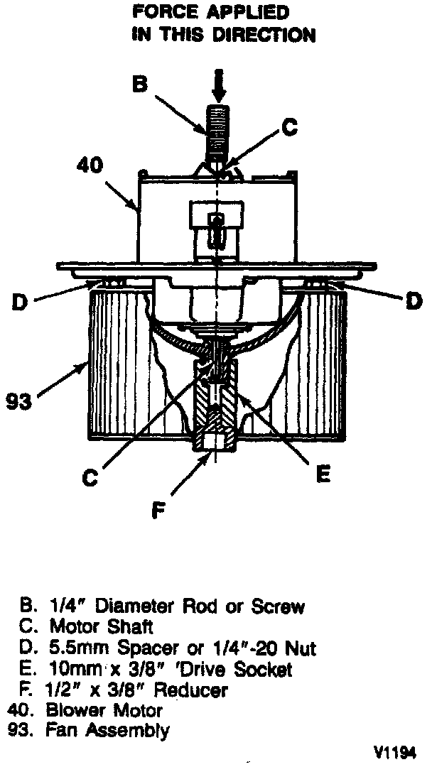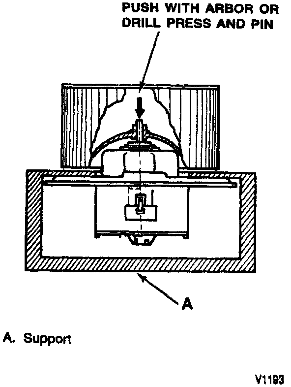 - Place steady pressure on tip of motor shaft, with a drill press or small arbor press and pin arrangement. Motor should fall freely from the fan after moving motor shaft about 12.7 mm (1/2 inch).