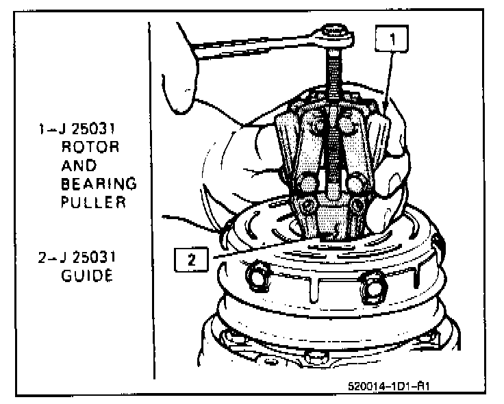 3. Install Rotor and Bearing Puller J 25031 down into the rotor until the Puller arms engage the recessed edge of the rotor hub. Hold the Puller and arms in place and tighten the Puller screw against the Puller Guide to remove the Clutch Rotor and Bearing assembly, being careful not to drop the Puller Guide.