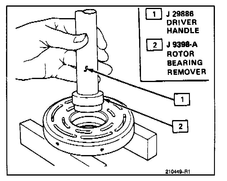 5. Place the Rotor and Bearing assembly on blocks. Drive the bearing out of the rotor hub with Rotor Bearing Remover J 9398-A.