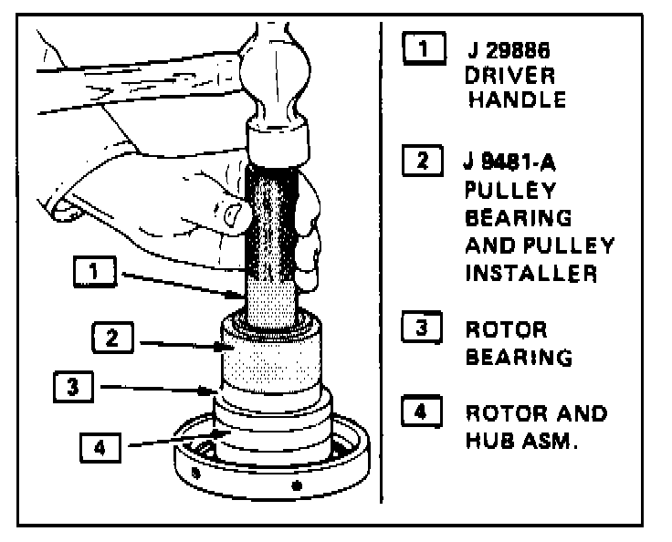 2. Align the new bearing squarely with the hub bore and using Pulley and Bearing Installer J 9481-A with Universal Handle J 29886, drive the bearing fully into the hub. The Installer will apply force to the outer race of the bearing if used.