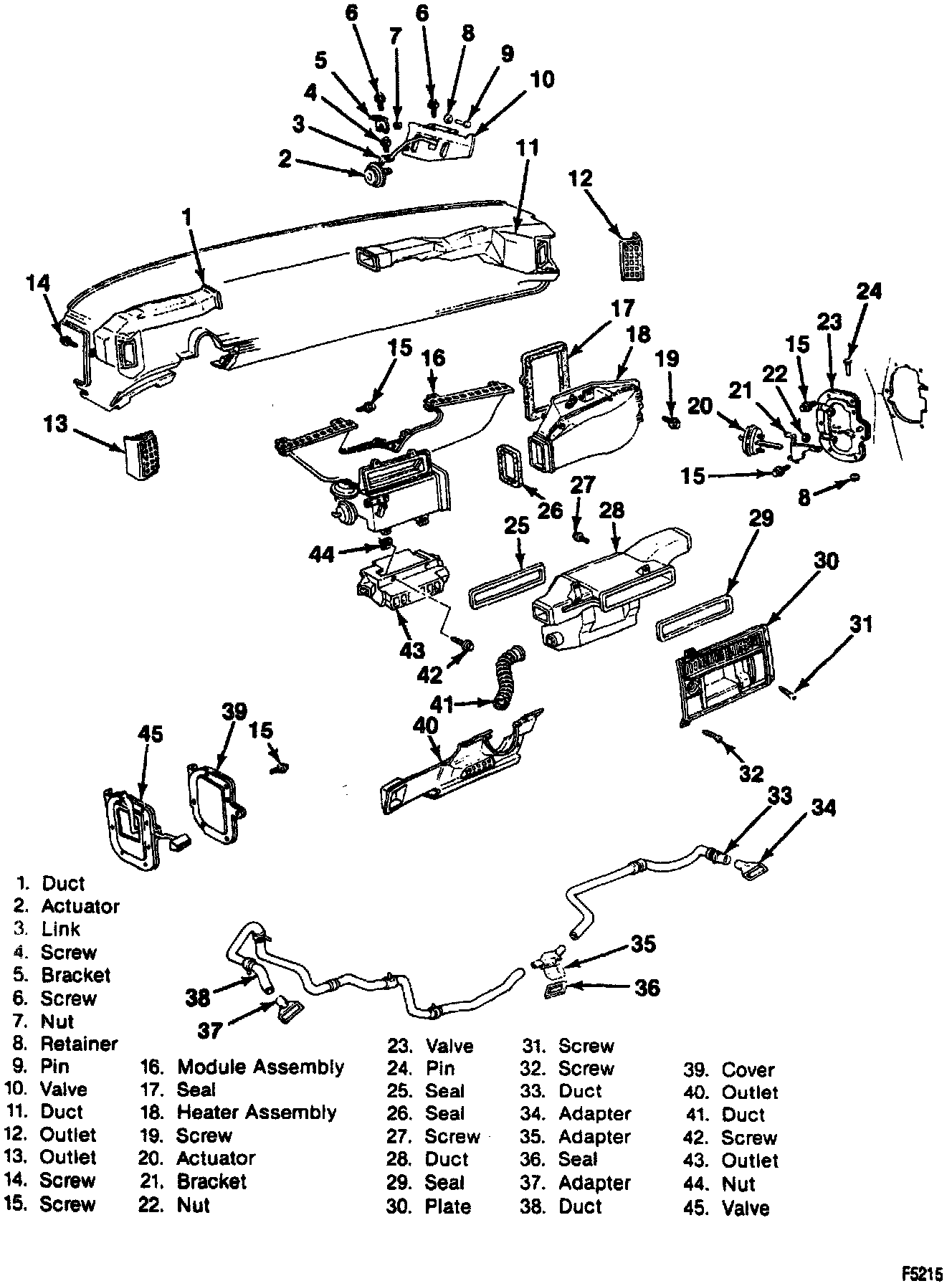 In the "HTR" (heater) and defrost mode, outside air is driven by the blower to the temperature door which, depending upon its position as controlled by the operator, distributes all or some portion of the inlet air through the heater core. The vent door will prevent air entry into the vent duct and direct this ambient air to the mix portion of the heater module. The air is thus heated, mixed, and then directed into either the defroster duct or the heater outlet by the position of the mode valve and control lever. A small amount of air is bled to the side window defroster system.