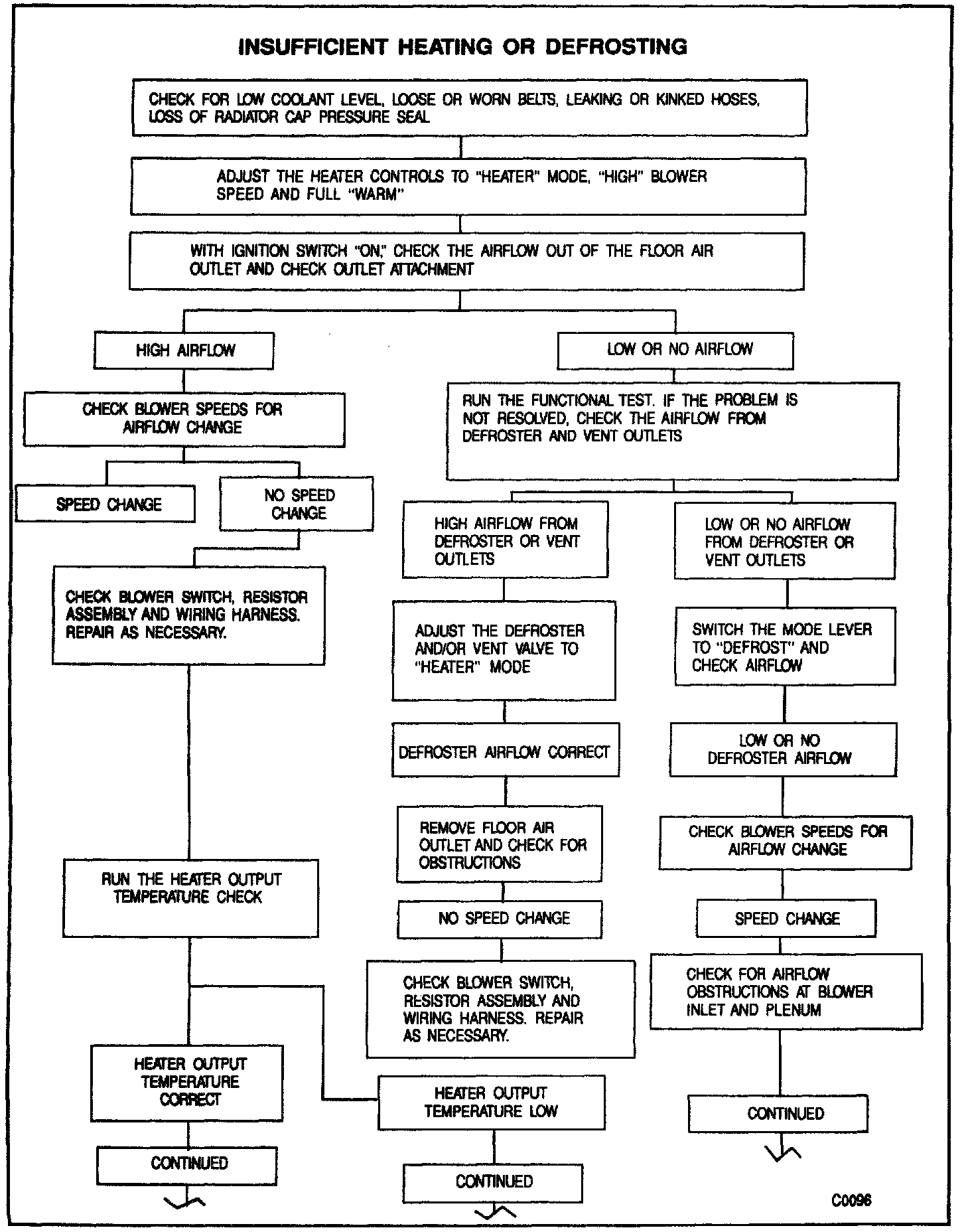 The most likely causes of insufficient heating outside the heater system include a low coolant level. a faulty thermostat, a partially or fully clogged heater core or hose, an obstruction to air circulation or an air leak past a faulty seal into the passenger compartment For an organized diagnosis procedure, refer to the accompanying figures.
