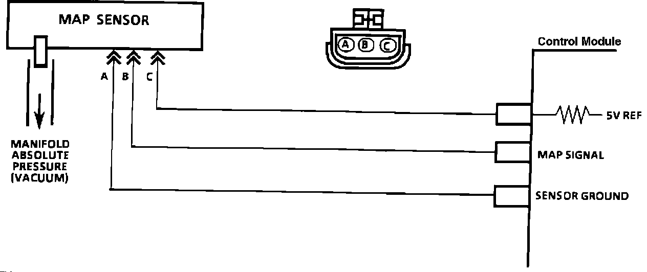 The ECM sends a 5.0 volt reference signal to the MAP sensor. As pressure changes in the intake manifold occur, the electrical resistance of the MAP sensor also changes. By monitoring the sensor output voltage, the ECM can determine the manifold pressure. At lower pressure output voltage will be about 1 to 2 volts at idle. At higher pressure or at Wide Open Throttle (WOT) output voltage will be about 4 to 4.8 volts. The higher the MAP voltage output the lower the engine vacuum, which requires more fuel. The lower the MAP voltage output the higher the engine vacuum, which requires lee fuel.
