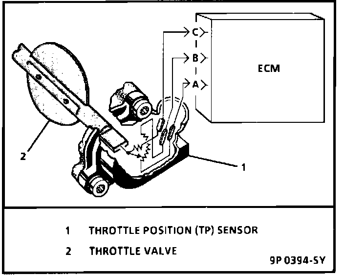As the throttle valve rotates in response to movement of the accelerator pedal, the throttle shaft transfers this rotation movement to the TP sensor. A potentiometer (variable resistor) within the Throttle Position (TP) sensor assembly changes its resistance in proportion to throttle movement.
