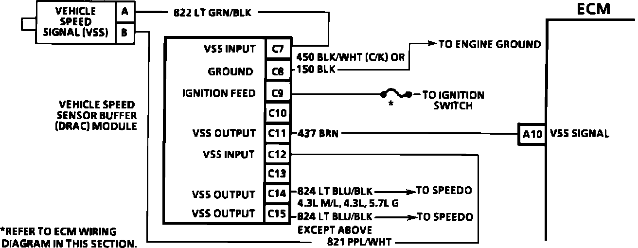 The VSS is a Permanent Magnet (PM) generator that produces a pulsing Alternating Current (AC) voltage as each rotor tooth nears the coil. As the vehicle speed increases, the number of AC voltage pulses increase and is converted by the ECM to MPH (KM/H). A VSS buffer is incorporated into the ECM for operating the instrument panel speedometer and odometer.