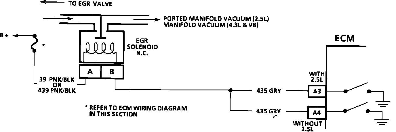 To regulate EGR flow, the control module operates a solenoid to control the EGR valve. This solenoid is normally closed. By providing a ground path, the control module energizes the solenoid which then allows vacuum to pass to the EGR valve.