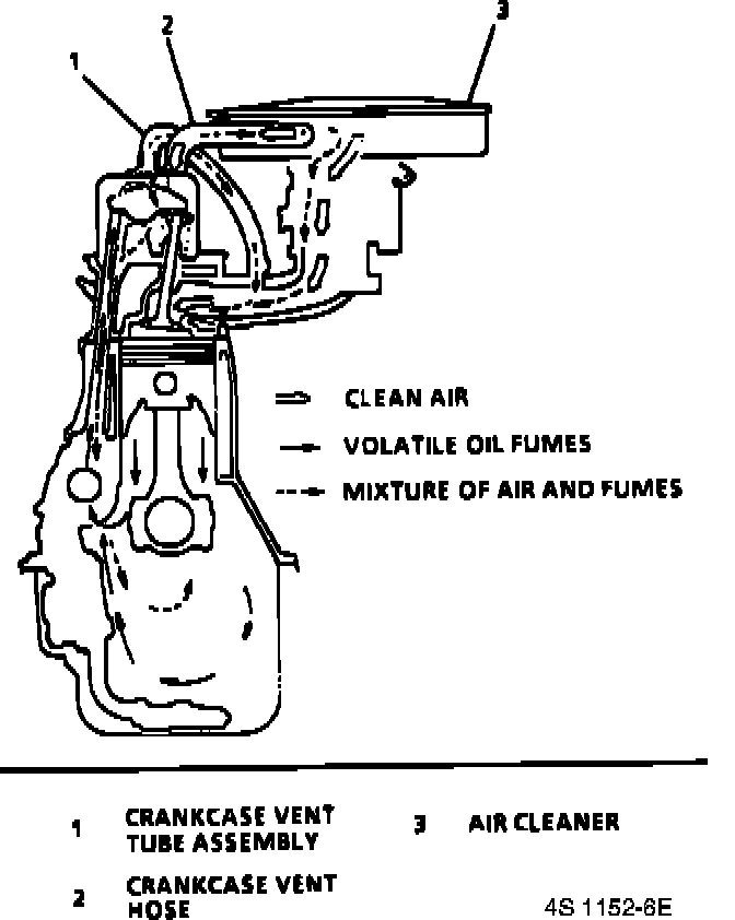 Fresh air from the air cleaner, through a filter, is supplied to the crankcase, mixed with blow-by gases and then passed through the crankcase vent tube assembly into the intake manifold.