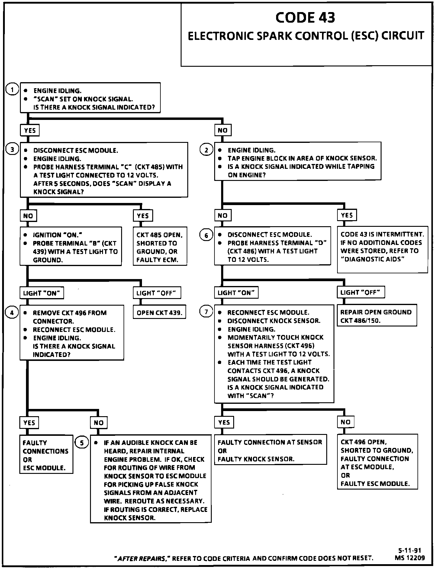 1. If the conditions for a Code 43 are present, the Tech 1 "Scan" tool will always display "YES." There should not be a knock at idle unless an internal engine problem, or a system problem exists.