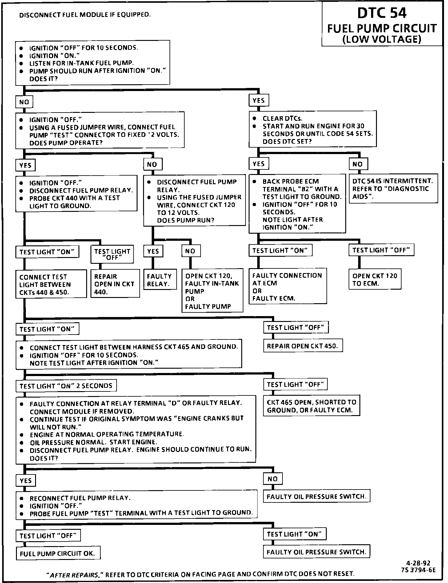 Code 54 will set if the voltage at terminal "B2" is less than 2 volts for 1 second since the last reference pulse was received. This code is designed to detect a faulty relay, causing extended crank time, and the code will help the diagnosis of an engine that "Cranks But Will Not Run".