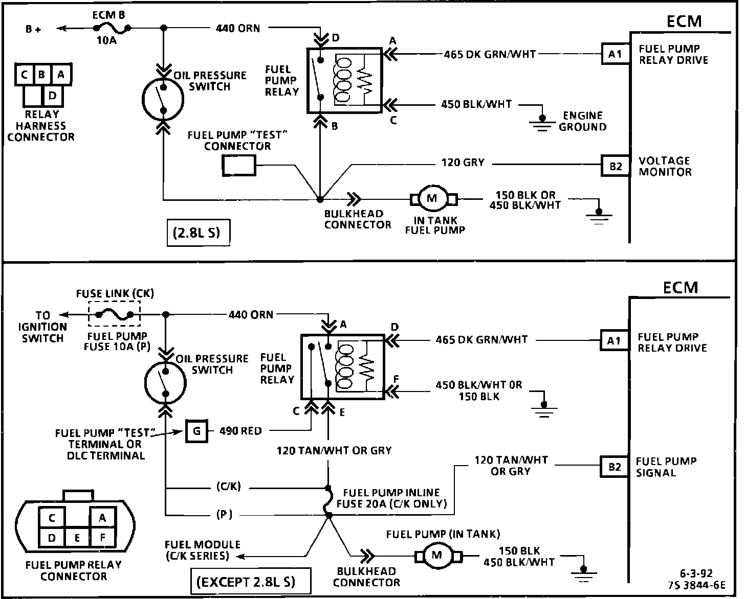The status of the fuel pump CKT 120 is monitored by the ECM at terminal "B2" and is used to compensate fuel delivery based on system voltage. This signal is also used to store a code if the fuel pump relay is defective or fuel pump voltage is lost while the engine is running. There should be about 12 volts on CKT 120 for at least 2 seconds after the ignition is turned "ON", or any time reference pulses are being received by the ECM.
