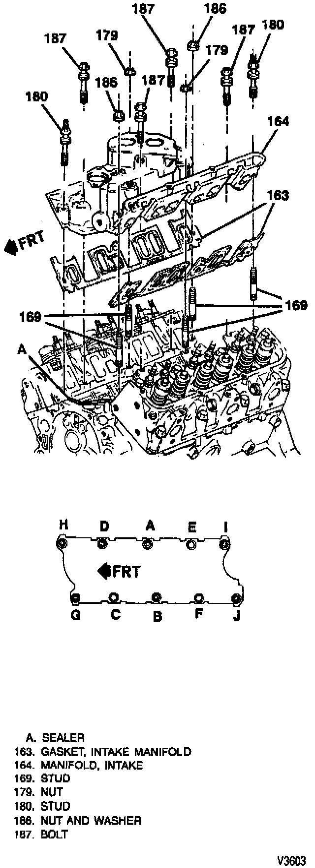 ^ Use sealer (GM P/N 9985427 or equivalent) at intake manifold holes "A" and "B" only.