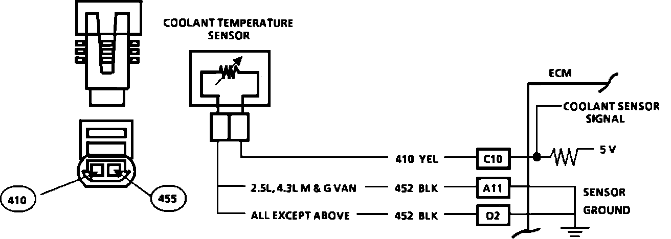 The control module sends a 5 volt signal to the ECT through a resistor in the computer and measures the voltage. The voltage will be high or low depending on coolant temperature. By varying the voltage the computer can determine engine coolant temperature.
