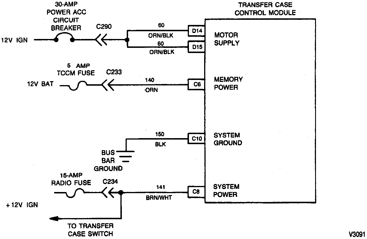 Operating power is controlled by the ignition switch and is protected by a 15-amp radio fuse. System power is supplied to TCCM connector pin C8 through circuit 141. This fuse also supplies, voltage to pin B of the transfer case switch. The system power will shut down if either the 5-amp TCCM fuse or the 15-amp radio fuse are removed or blown.