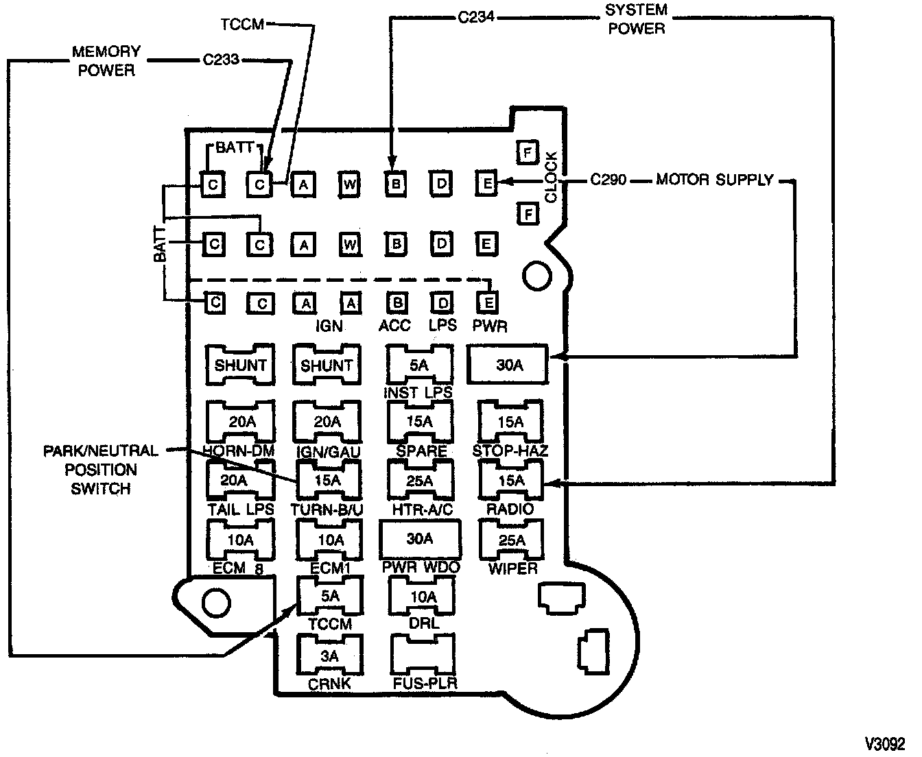 A 15-amp TURN/BU fuse supplies ignition voltage to the park/neutral position switch. This voltage enables the park switch to send a park signal to TCCM connector pin D2.