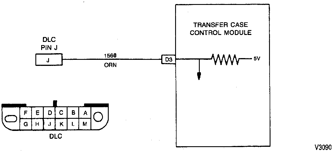 When pin J of the Data Link Connector (DLC) is connected either to pin A of the DLC or to a good ground while the ignition is on, the diagnostics routine of the Transfer Case Control Module (TCCM) is activated. When the diagnostics routine is activated, the transfer case selector switch 4HI and 4LO status lamps flash the diagnostic codes.