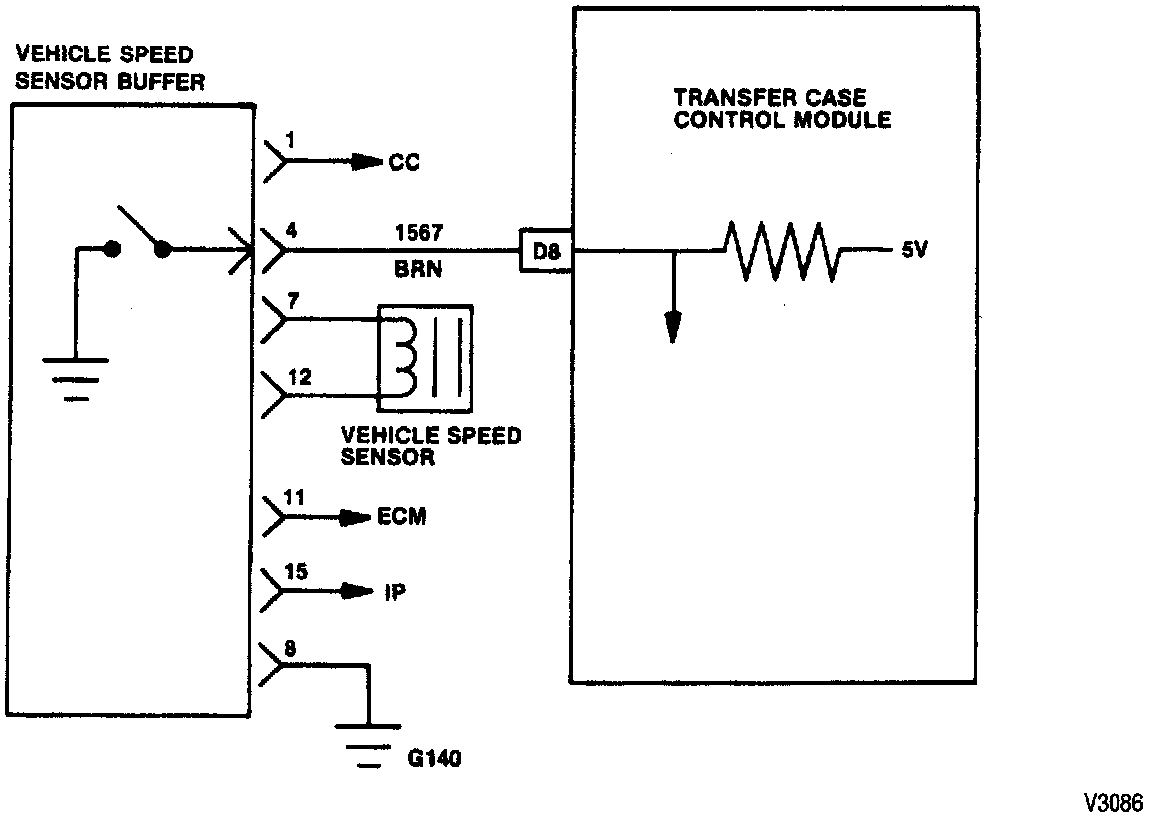 The vehicle speed sensor buffer informs the Transfer Case Control Module (TCCM) about the speed of the vehicle in miles per hour. Such information is essential to inform the TCCM to prohibit range shifts at speeds above 3 mph. The vehicle speed sensor (VSS) is a variable-reluctance magnetic sensing device that converts tone wheel rotation into a frequency and voltage output proportional to the vehicle speed. The frequency and voltage signal is sent to the vehicle speed sensor buffer which converts the speed sensor output into a useful pulse signal. The vehicle speed sensor buffer then, pulses circuit 1567 to ground at a rate of 4000 pulses per mile. Whenever the vehicle speed sensor buffer grounds circuit 1567, the voltage at TCCM connector pin D8 returns to 5 volts. The TCCM reads the 4000 pulses-per-mile (1.11 Hz per mph) signal to determine vehicle speed.
