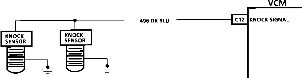 The VCM applies 5 volts to CKT 496. A 8900 ohm resistor in the knock sensors reduces the voltage to about 2.5 volts. When knock occurs, the knock sensor produces a small AC voltage that rides on top of the 2.5 volts already applied. An AC voltage monitor, in the VCM, is able to read this signal as knock and incrementally retard spark.