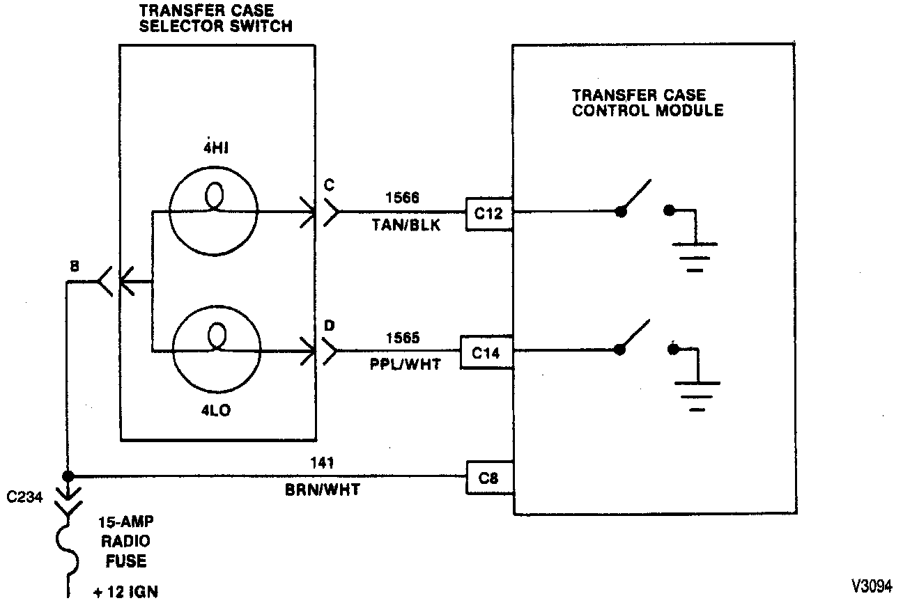 The Transfer Case Control Module (TCCM) controls the operation of the 4HI and 4LO status lamps in the transfer case selector switch. The status lamps also show the transfer case mode and range of operation. The status lamps also provide a self-test when the ignition is first turned on. Additionally, the status lamps are used to alert the driver that there is a problem somewhere in the four-wheel drive system, and also to flash diagnostic trouble codes (DTC's).