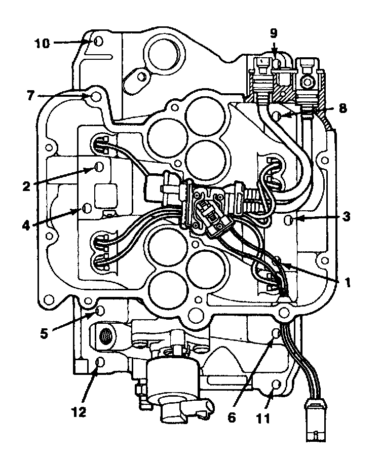 3. Upper intake manifold bolts. Note the marks made at disassembly for proper stud location. Tighten bolts to 14 Nm (124 inch lbs.) using the sequence shown in figure 20.