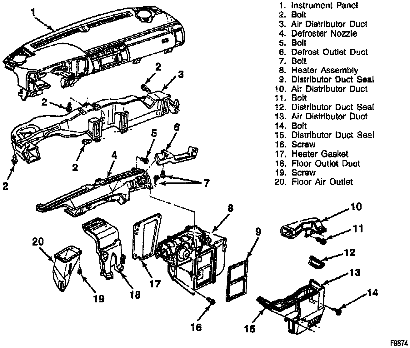 In the "HTR" (heater) and defrost mode, outside air is driven by the blower to the temperature door which, depending upon its position as controlled by the operator, distributes all or some portion of the inlet air through the heater core. The vent door will prevent air entry into the vent duct and direct this ambient air to the mix portion of the heater module. The air is thus heated, mixed, and then directed into either the defroster duct or the heater outlet by the position of the mode valve and control lever. A small amount of air is bled to the side window defogger system.