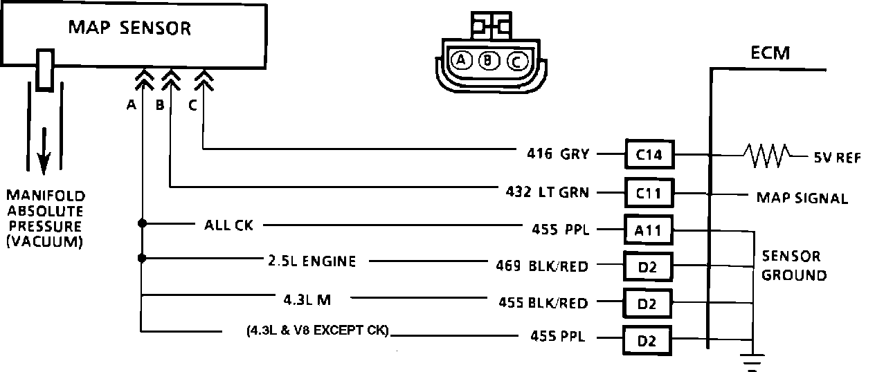 2. Applying 34 kPa (10" Hg) vacuum to the MAP sensor should cause the voltage to change. Subtract second reading from the first. Voltage value should be greater than 1.5 volts. Upon applying vacuum to the sensor, the change in voltage should be instantaneous. A slow voltage change indicated a faulty sensor.