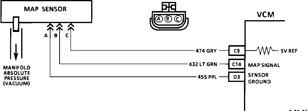 The Manifold Absolute Pressure (MAP) sensor measures the changes in the intake manifold pressure which result from engine load (intake manifold vacuum) and rpm changes; and converts these into a voltage output. The control module sends a 5 volt reference voltage to the MAP sensor. As the manifold pressure changes, the output voltage of the sensor also changes. By monitoring the sensor output voltage, the control module knows the manifold pressure. At lower pressure output voltage will be about 1 to 2 volts. While at higher pressure or at Wide Open Throttle (WOT) output voltage will be about 4 to 4.8 volts.The MAP sensor is also used, under certain conditions, to measure barometric pressure, allowing the control module to make adjustments for different altitudes. The control module uses the MAP sensor to control fuel delivery and ignition timing.