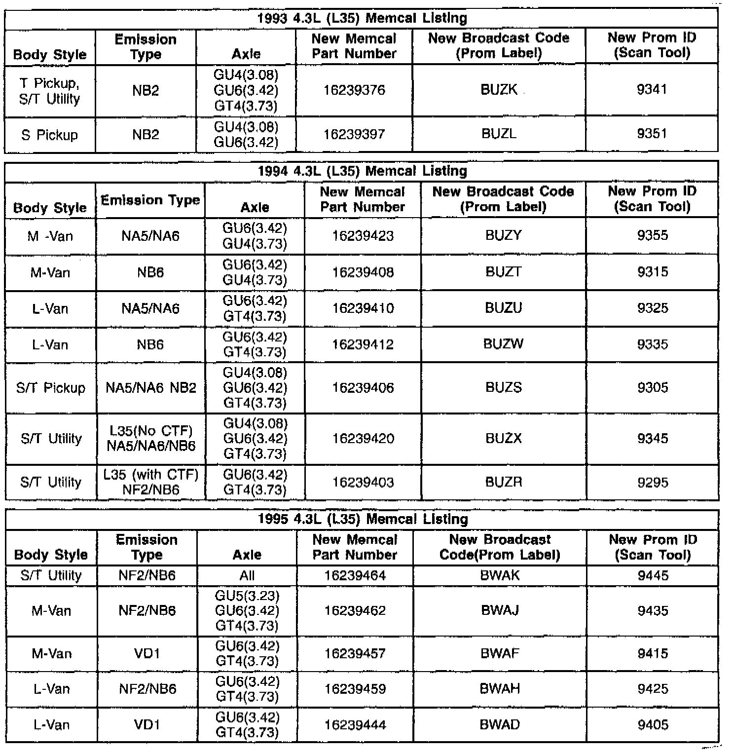 In addition to replacing the PCM, the associated Memcal must also be replaced. Choose the appropriate Memcal from the listed tables.