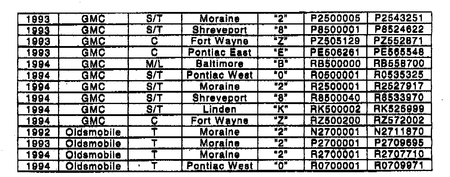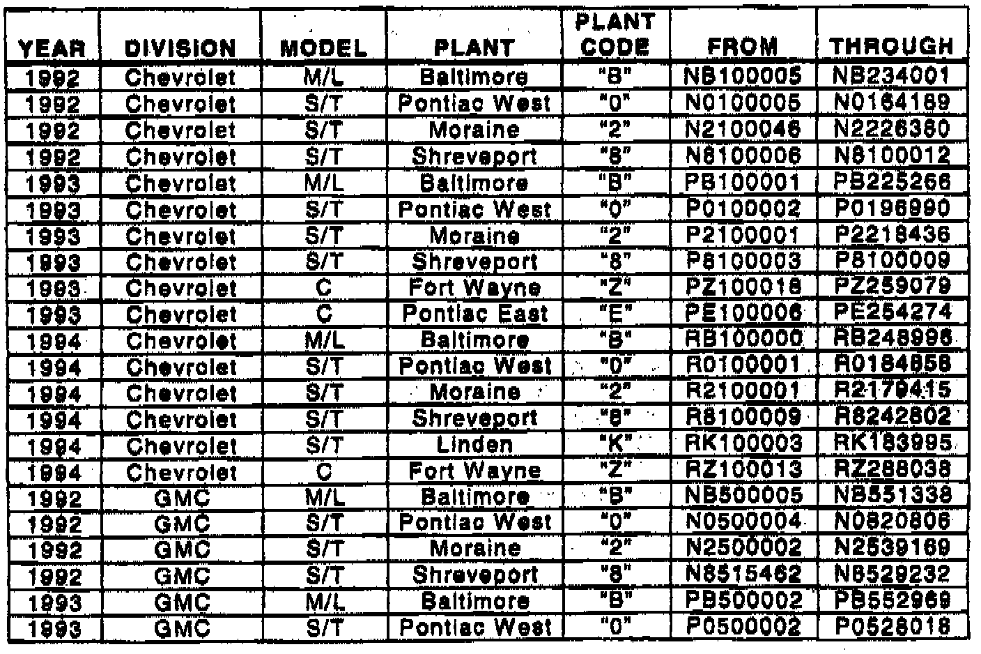 Involved are certain 1992 - 1994 S/T, M/L and C trucks equipped with 4.3L engines built within the VIN breakpoints as shown.