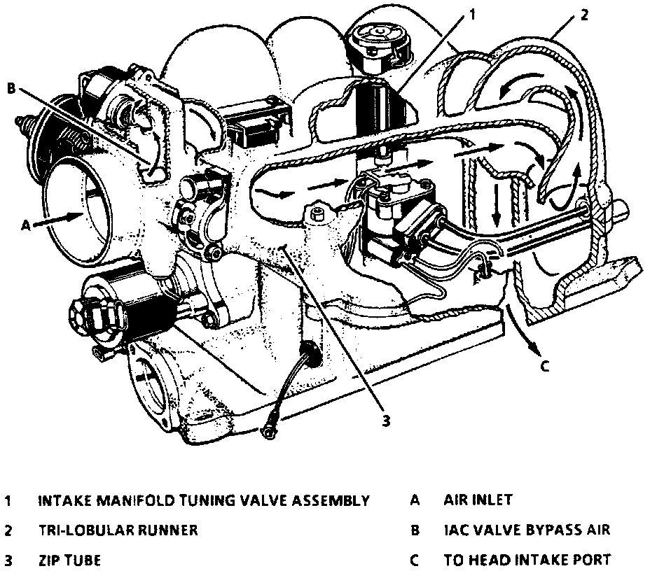 The tuning valve (rotary solenoid device) is electrically controlled by the PCM based on RPM and TP signal inputs, for accurate switching capability at optimum switching points to enable either a "split" or "single" plenum condition