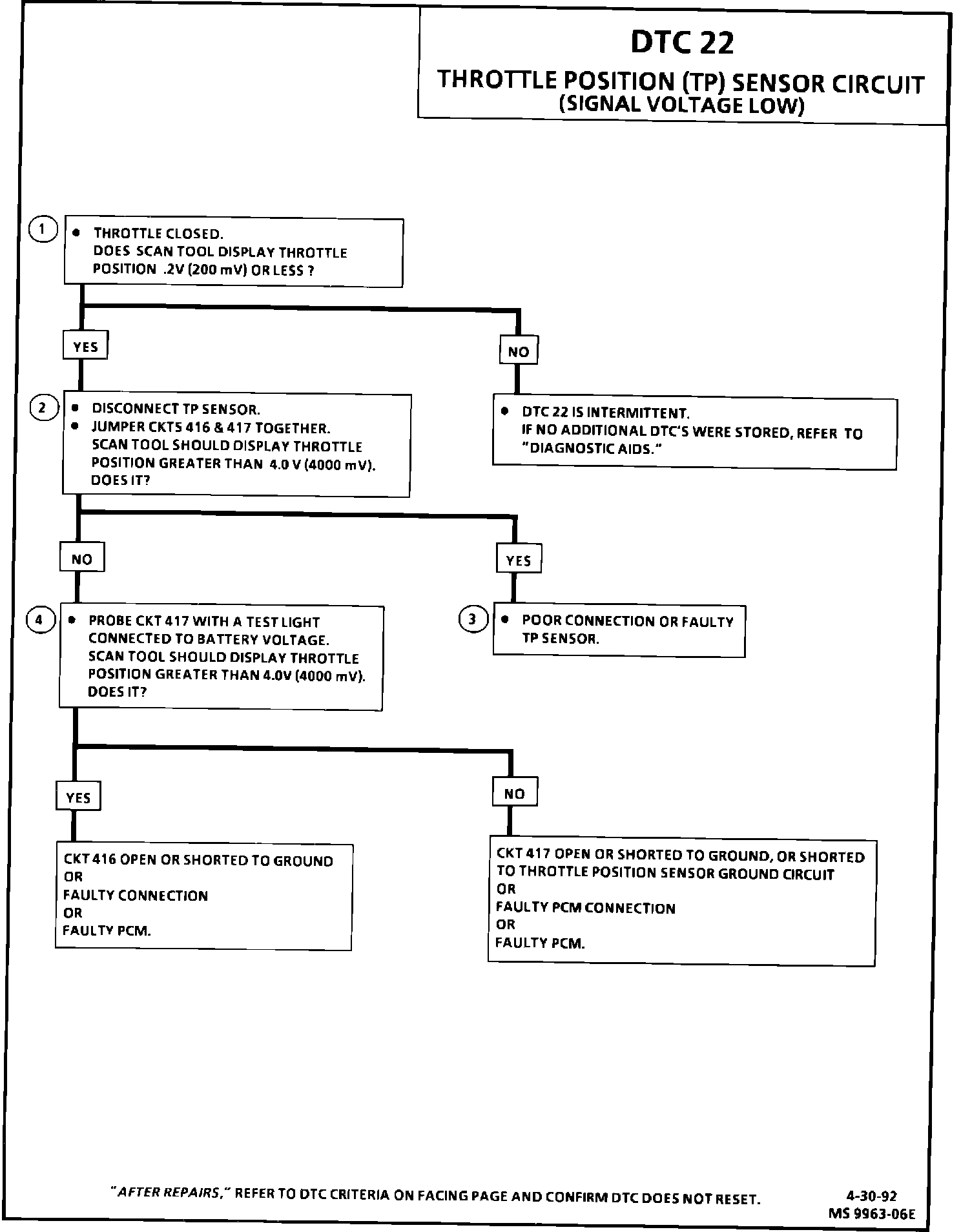 An open or short to ground in CKTs 416 or 417 will result in a code 22.