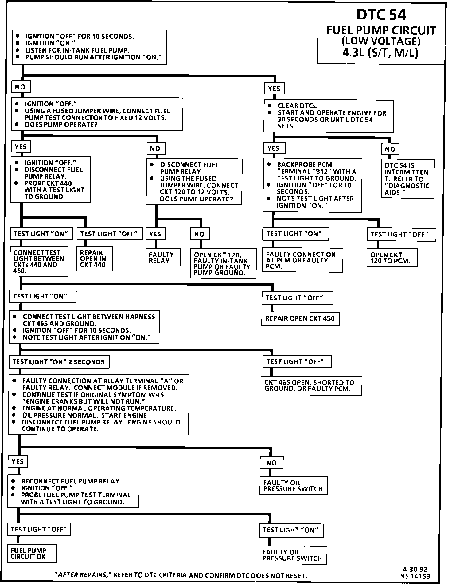 DTC 54 will set if the voltage at "F6" is less than 2 volts for 1.5 seconds since the last reference pulse was received. This DTC is designed to detect a faulty relay, causing extended crank time, and the DTC will help diagnose an engine that "Cranks But Will Not Run."