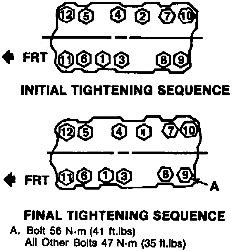 c. Torque manifold attaching bolt A to 41 ft. lbs. and all other bolts to 35 ft. lbs. in sequence shown in Fig. 8. and.