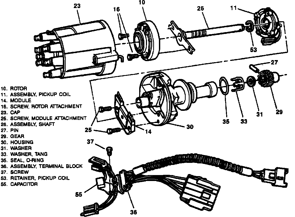 The distributor uses an internal magnetic pickup assembly that consists of a permanent magnet, pole piece with internal teeth, and pickup coil. When the rotating teeth of the timer core line up with the teeth of the pole piece, voltage is induced in the pickup coil. This voltage signals the ignition control module to trigger the primary ignition circuit. Current flow in the primary circuit is interrupted and a high voltage of up to 35,000 volts is induced in the ignition coil secondary winding. This high voltage is directed through the secondary ignition circuit to fire the spark plugs.