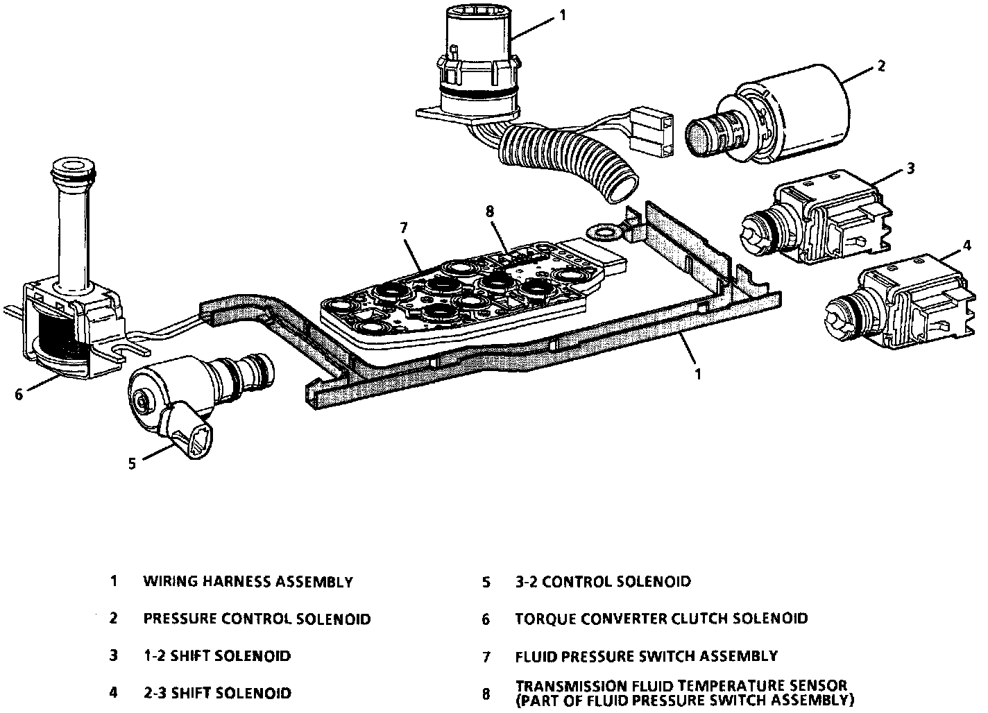4. TCC Solenoid bolts (68 in Fig. 1) and solenoid assembly with 0-ring seal and wiring harness.