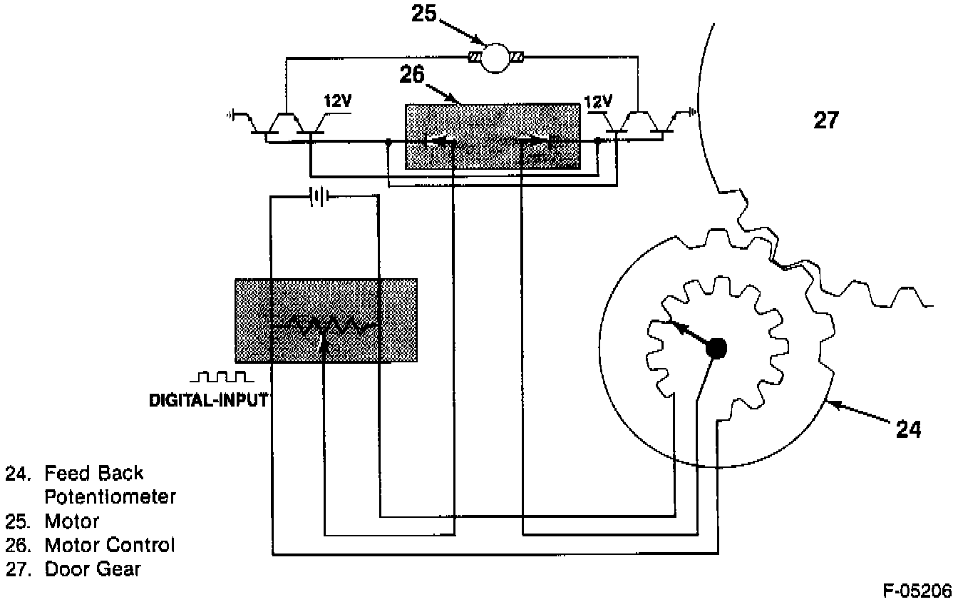 The feedback potentiometer is driven by the final drive gear. A five-volt input signal, feedback circuit and ground are used to signal door position.