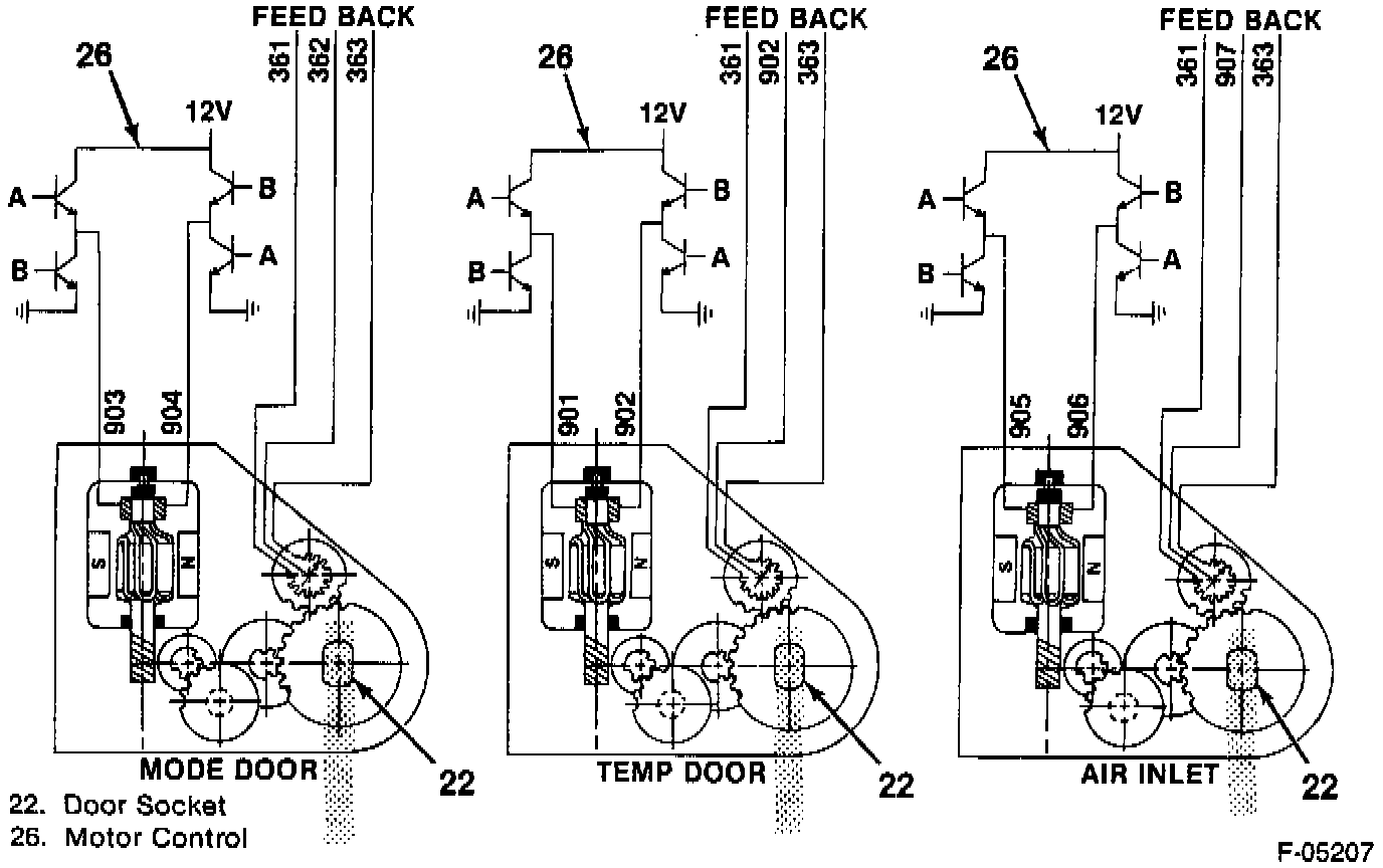 The three control door motors are wired to the microprocessor with several common circuits. Circuit 361 is the common grounding point for the feedback potentiometers while circuit 363 supplies the five-volt input to each. The feedback circuits are separated and wired individually to the control head.