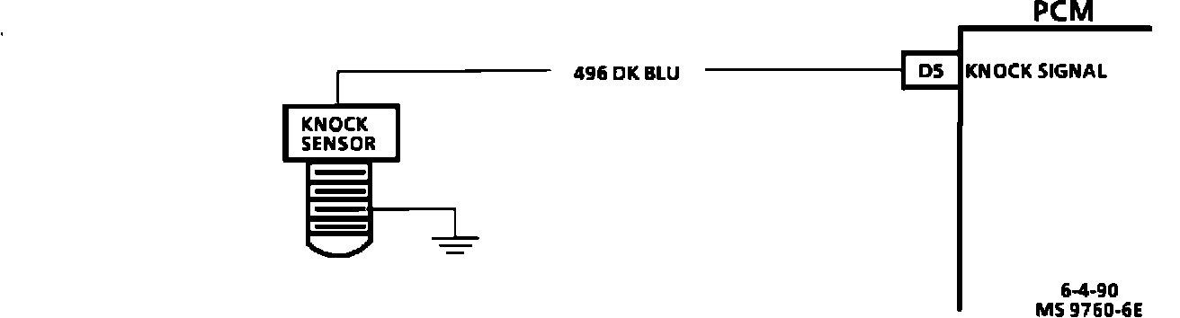 The PCM applies 5 volts to CKT 496. A 3900 ohm resistor in the knock sensors reduces the voltage to about 2.5 volts. When knock occurs, the knock sensor produces a small AC voltage that rides on top of the 2.5 volts already applied. An AC voltage monitor, in the PCM, is able to read this signal as knock and incrementally retard spark.