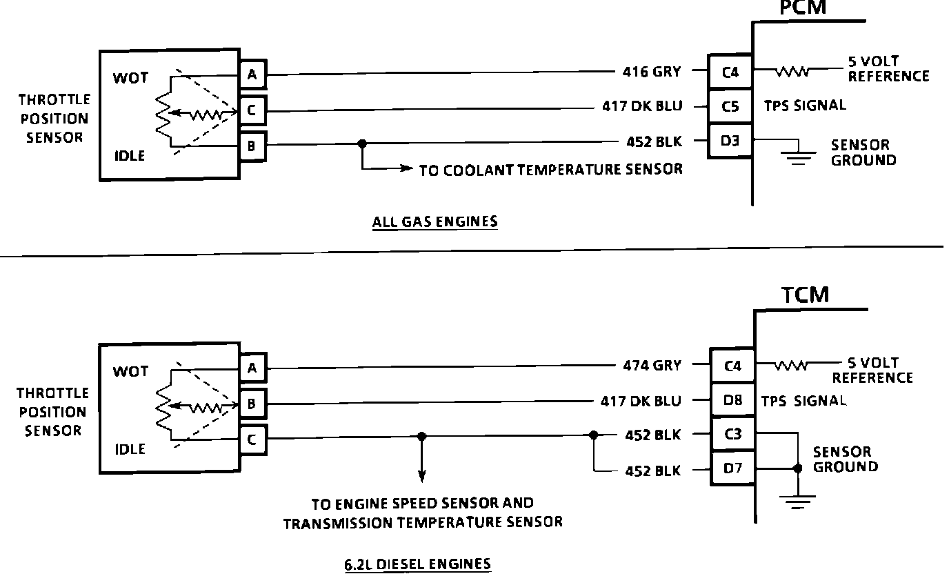 The TPS is a potentiometer with one end connected to 5 volts from the PCM/TCM and the other to ground. A third wire is connected to the PCM/TCM to measure the voltage from the TPS.