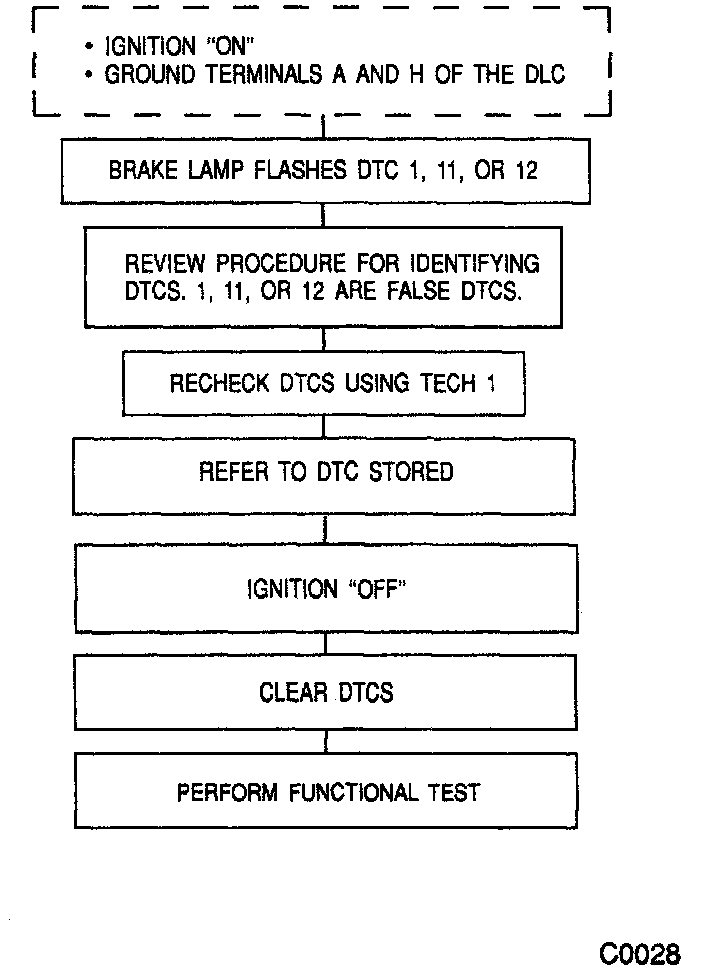 Diagnostic Trouble Codes (DTC)s 1,11 and 12 do not exist. They are the result of misreading the BRAKE lamp flashes. The Tech 1 scan tool will not display these DTCs. If these DTCs are encountered, review the procedure for manually reading DTCs.