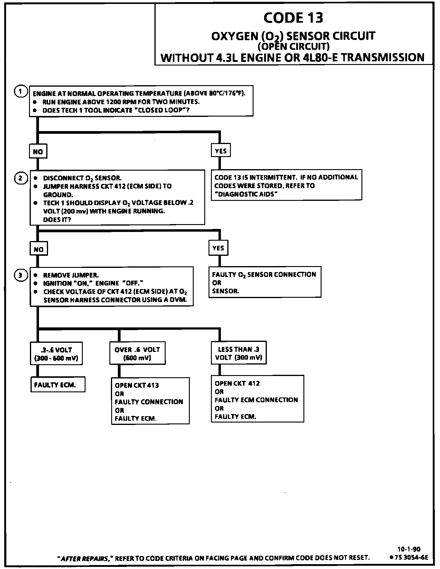 Normal Tech 1 "Scan" tool voltage varies between 100 mV to 999 mV (.1 and 1.0 volt) while in "Closed Loop." Code 13 sets in one minute if voltage remains between .35 and .55 volt, but the system will go "Open Loop" in about 15 seconds. Verify a clean tight ground connection for CKT 413. Open CKT 412 or CKT 413 will result in a Code 13.